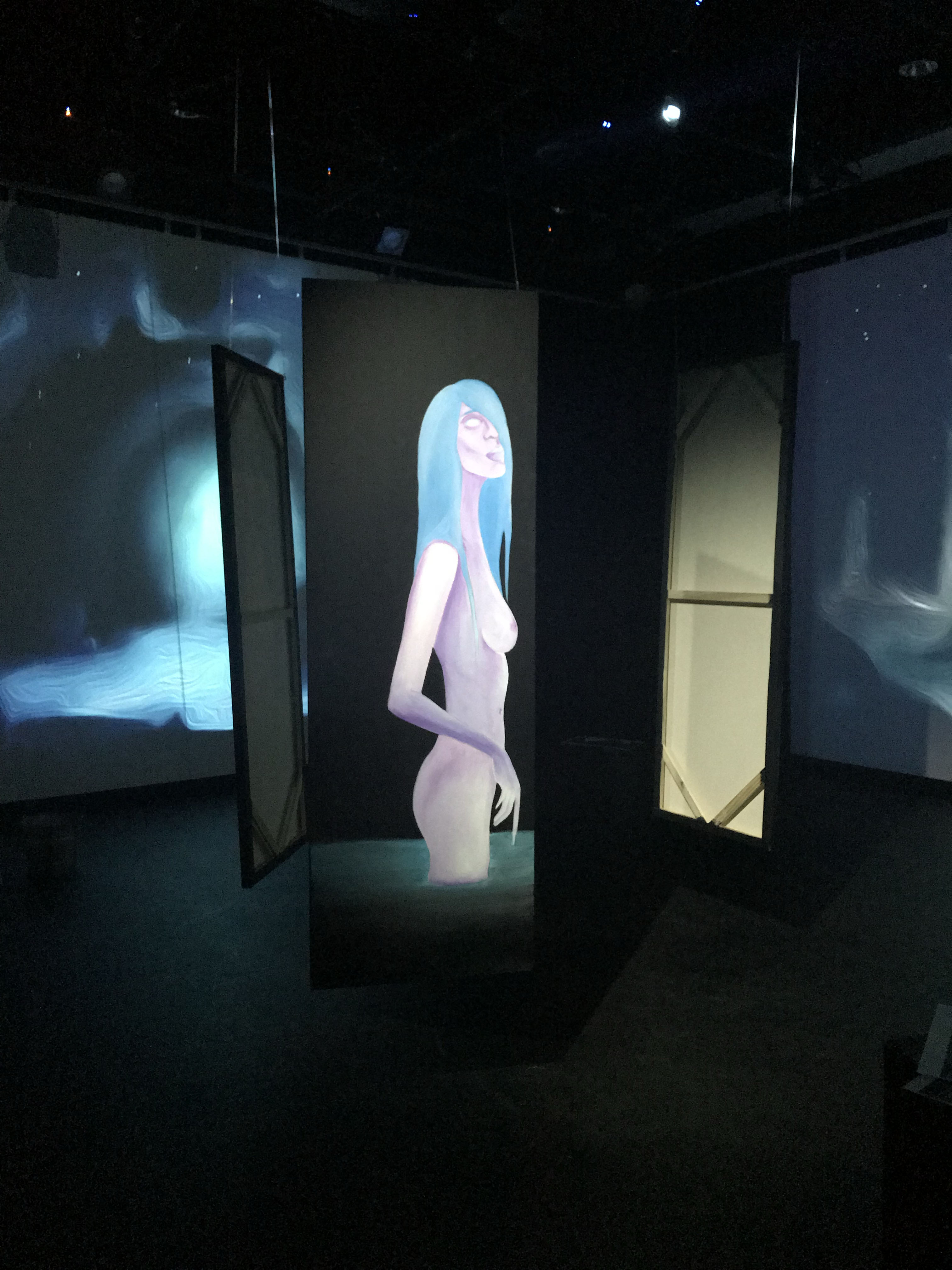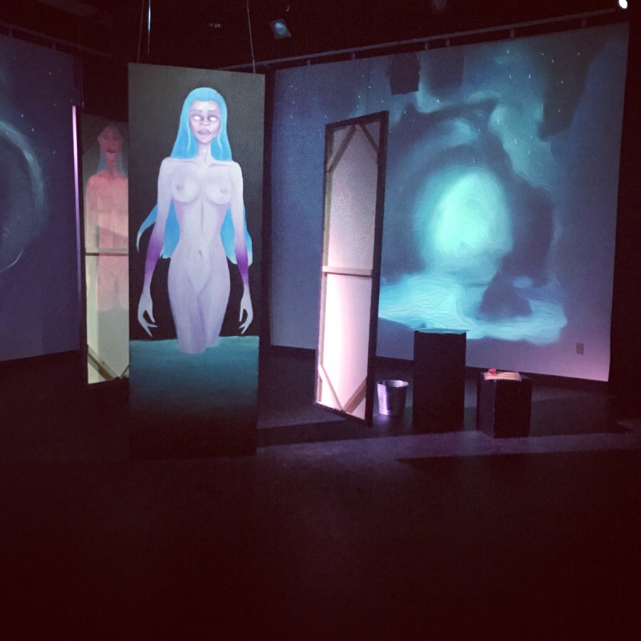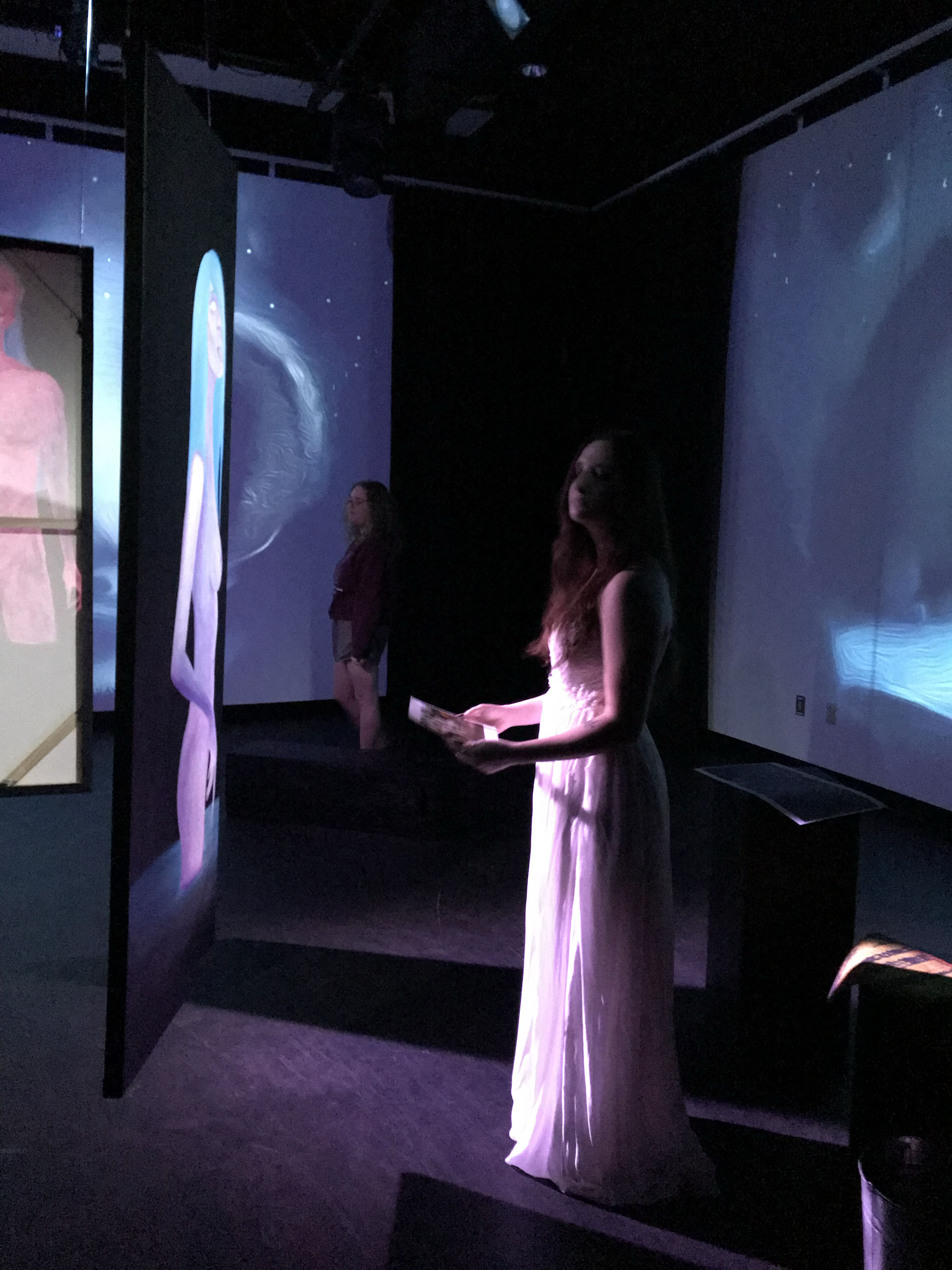 Through digital design programs such as Procreate and Adobe Photoshop, sound editing software such as Adobe Audition, video, sound, and light manipulation in Isadora, and traditional studio art and theatre, "Back Into the Light" came to life. It lived as a 15-minute interactive installation and performance, depicting the epilogue scene from the written story.